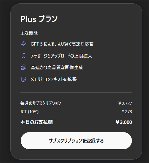 A. ChatGPTの 設定 → プラン(Plan)/アップグレード から、Plusの支払い画面で「3,000円(税込)」表示になっているか確認して、そのまま登録すればOKです。