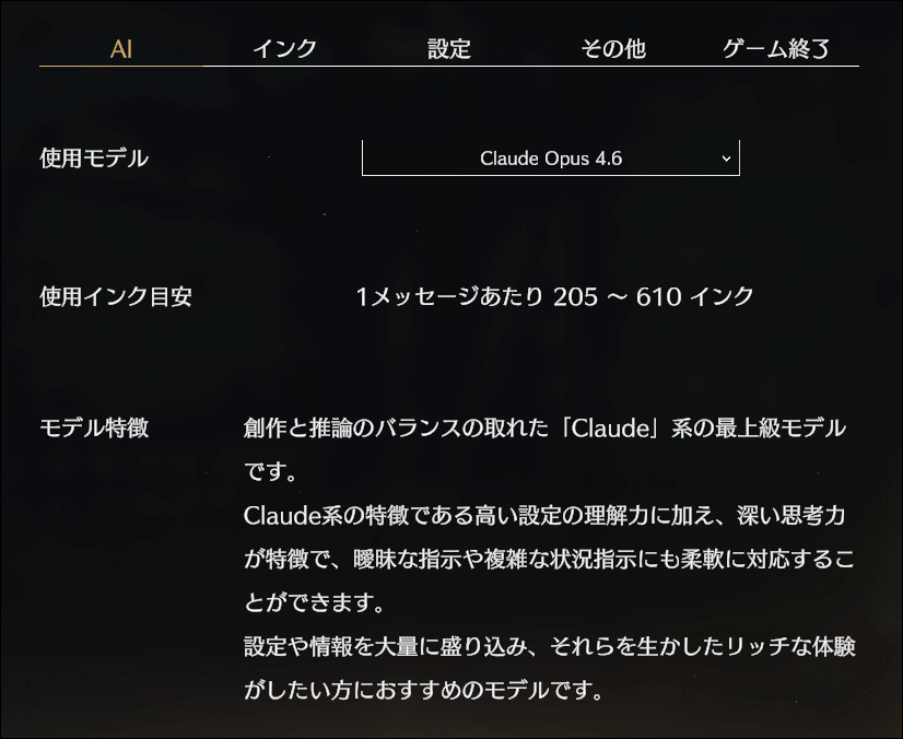 サガ Gemini・Claude Opus 4.6(205〜610インク)の場合、1メッセージあたり約$0.82〜$2.44。