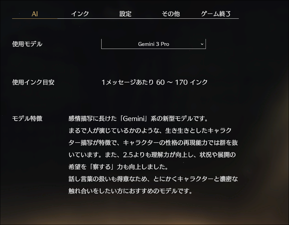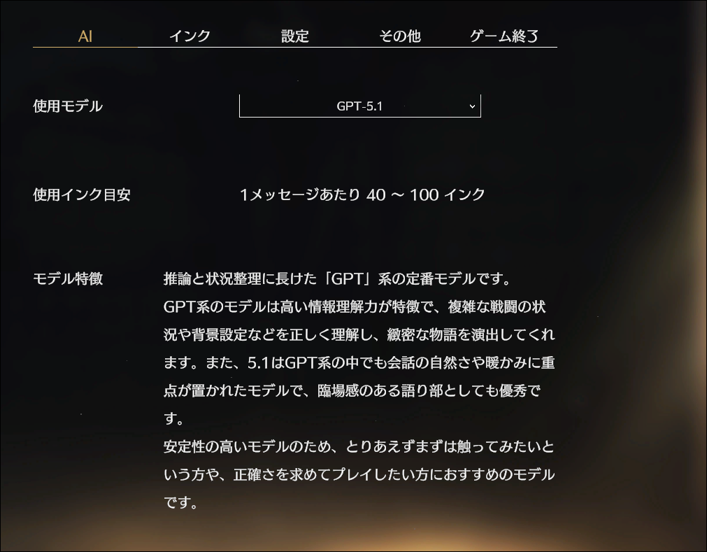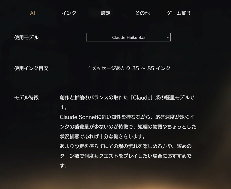 本作は「1メッセージ=1ターン」。AIボタンを押して呼び出す方式ではなく、こちらの文章入力1回ごとにターンが進み、そのたびにインクが消費される。