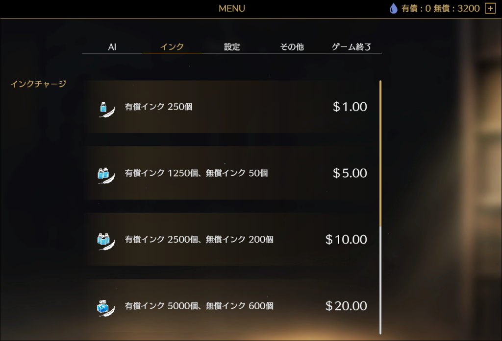 - 1ゲーム500インク=$2相当(最小パック基準)→為替で約300円前後の目安
