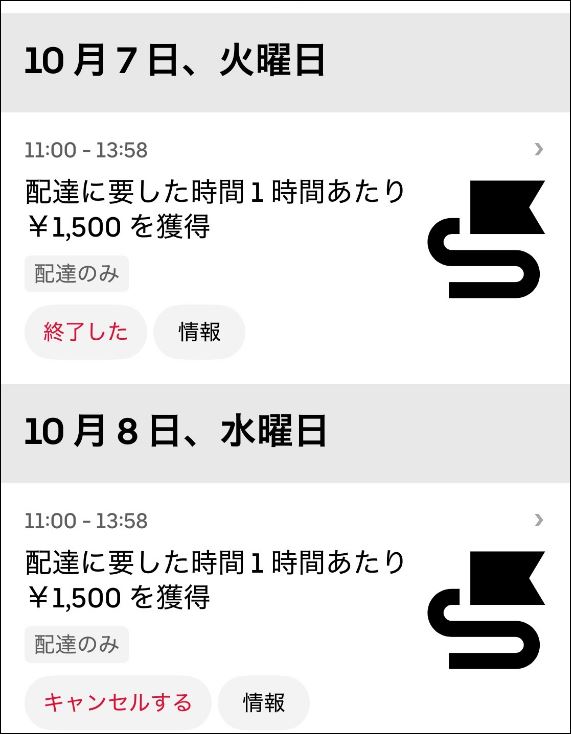 その画面(10月7日・8日の「1時間あたり¥1,500保証」)は、いわゆるUber Eatsの“配達に要した時間あたり報酬保証”=フラットレートキャンペーンの予約画面だね。